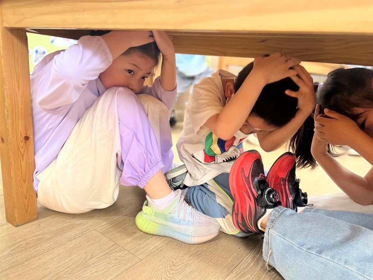 随着急促的地震警报声响起,演练拉开帷幕。孩子们听闻警报,迅速响应,在老师指引下就地寻找安全庇护。他们或双手抱头,敏捷地钻至坚固桌下;或蜷缩于墙角、厕角等安全区域,以书包或双手护住头部,有效防护自身安全。